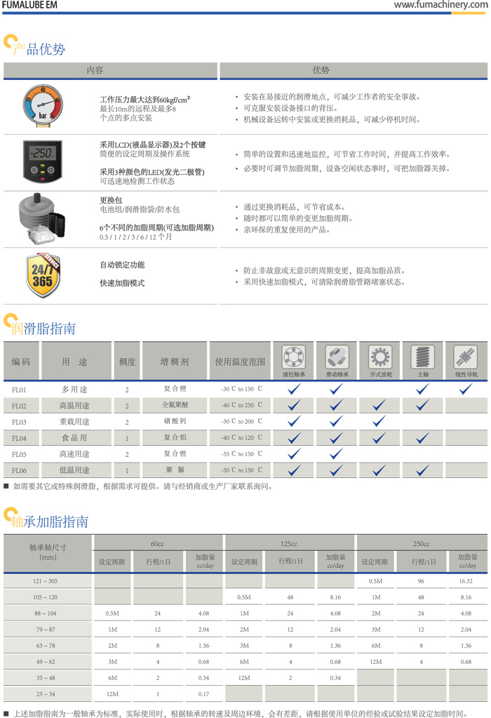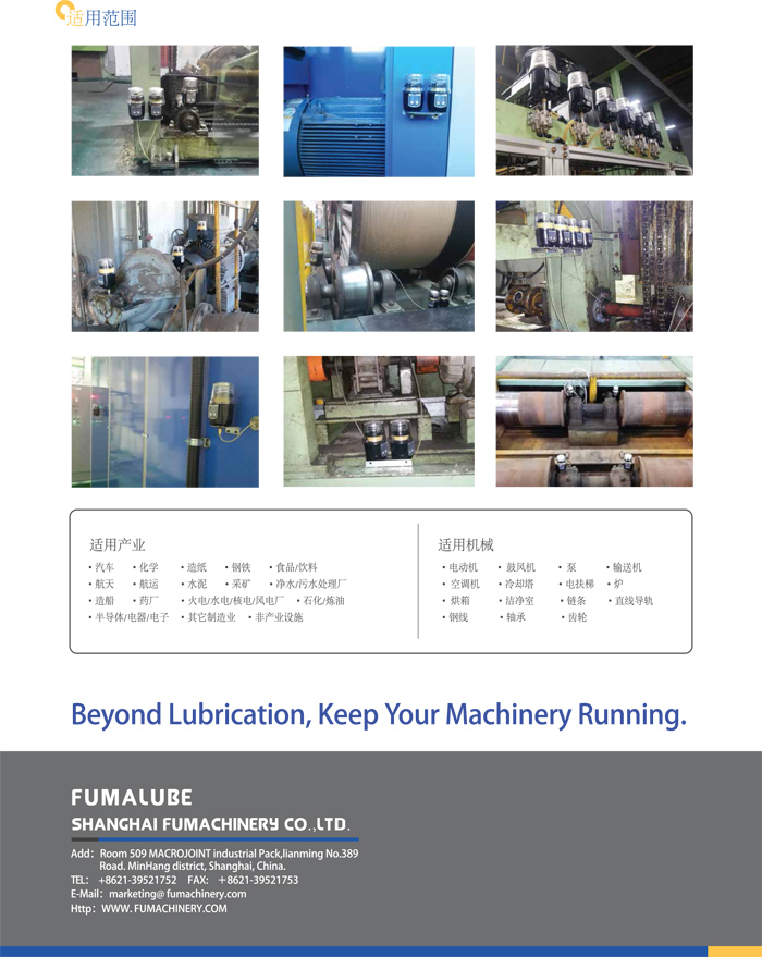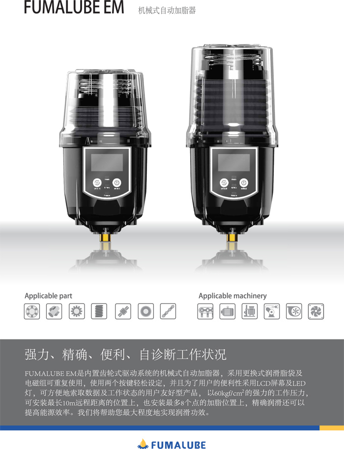 FUALUBE EM是內(nèi)置齒輪式驅(qū)動(dòng)系統(tǒng)的機(jī)械式自動(dòng)加脂器,采用更換式潤滑脂袋及電磁組可重復(fù)使用,使用兩個(gè)按鍵輕松設(shè)定,并且為了用戶的便利性采用LCD屏幕及LED燈,可方便地索取數(shù)據(jù)及工作狀態(tài)的用戶友好型產(chǎn)品,以60kfg/cm2的強(qiáng)力工作壓力,可安裝最長10m遠(yuǎn)程距離的位置上,也安裝最多8個(gè)點(diǎn)的加脂位置上,精確潤滑還可以提高能源效率。我們將幫助您最大程度地實(shí)現(xiàn)潤滑功效。